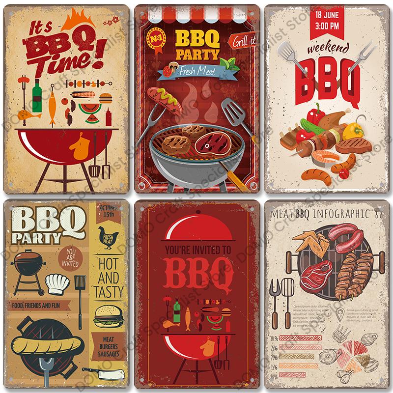 Vintage Barbecue Plaques Metal Tin Signs Grill Meat Steak Sausage Retro Metal Plate Wall Decor BBQ Party Shop Dining Room