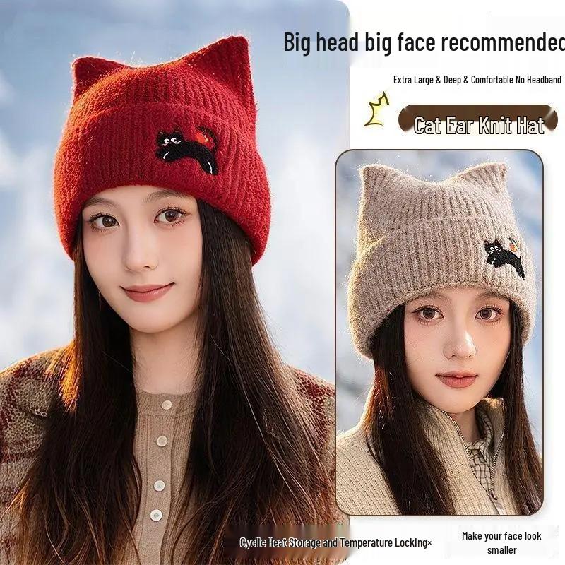 Women's Korean Style Autumn/Winter Wool Hat – Cute Cat Ears, Face-Slimming, Warm Knitted Beanie