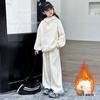 Introducing the perfect ensemble for your little one's wardrobe this autumn and winter. This three-piece set features a cozy fleece-lined sweatshirt, designed with long sleeves to ensure warmth and comfort during chilly days. Crafted from high-quality linen material, this outfit combines style and functionality for an effortlessly trendy and casual look. Ideal for both sportswear and everyday wear, this set offers the versatility and comfort that girls need for the season.