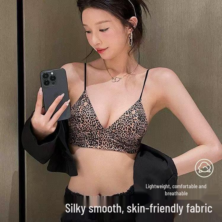 Leopard Print Wire-Free Deep V Lingerie Set - Women's Sexy Triangle Cup Spaghetti Strap Bra