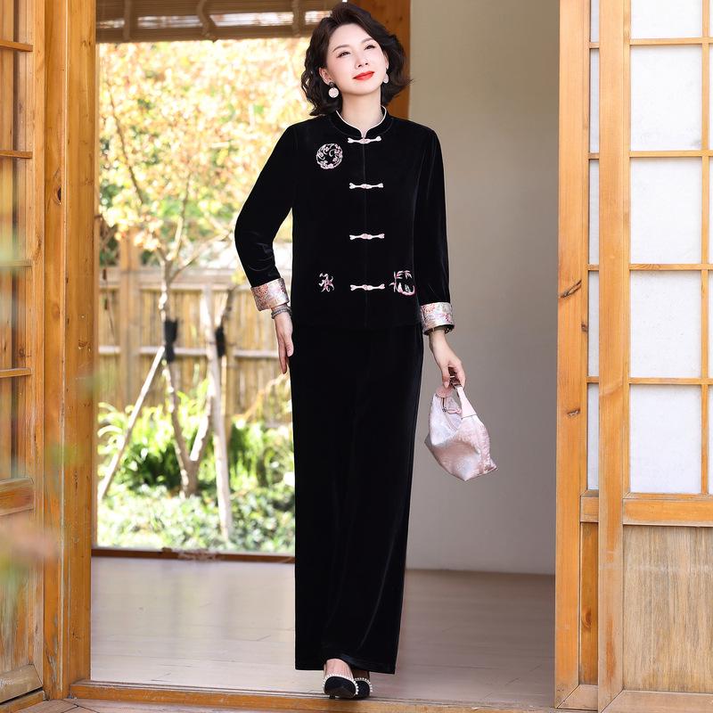 Introducing a timeless two-piece set designed for the modern middle-aged woman, perfect for both spring and autumn. This Classic Chinese Style Velvet Set features a unique print decoration that adds an elegant touch to its sportive style. Expertly crafted from high-quality polyester, the set ensures both comfort and durability. The luxurious feel of the polyester fur material enhances warmth without sacrificing style, making it an ideal choice for a chic and cozy look throughout the cooler seasons.