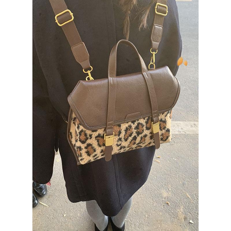 Winter Plush Leopard Print Splicing Fashion Women's Bag 2025 New Niche Shoulder Bag Portable Messenger Bag Backpack