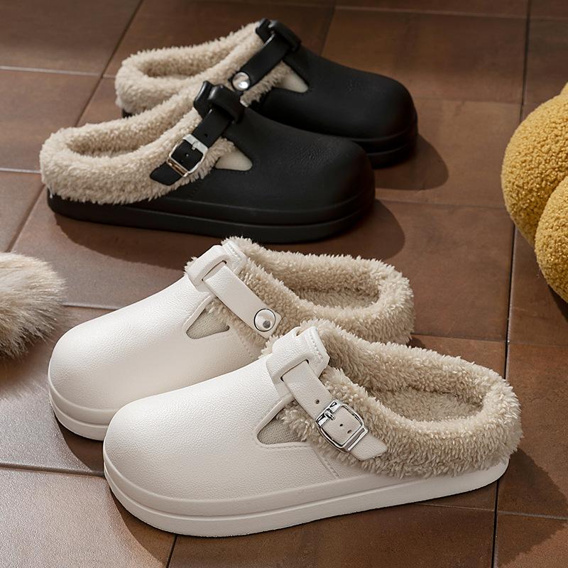 Men Women Slippers Waterproof Eva Warm Furry Slippers Women Winter Metal Buckle Warm Plush Slippers Soft Thick Bottom Non Slip Indoor Slides