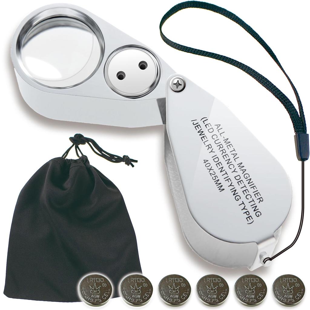 40x magnification! This compact magnifying glass is perfect for jewelry appraisal and proofreading! It features 40x magnification and an LED and black light for clear visibility even in the dark. It's perfect for proofreading, proofreading, observing, appraising banknotes and antiques, and checking detailed items. The LED light can be turned on with a switch.