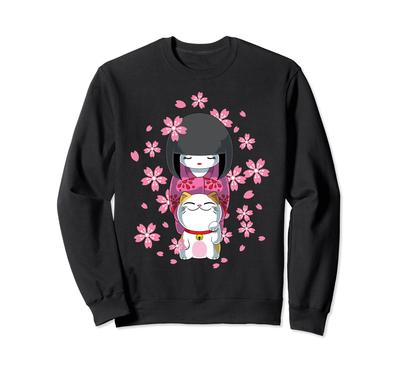Japanese Cute Kokeshi Doll Kimono and Lucky Cat Sweatshirt