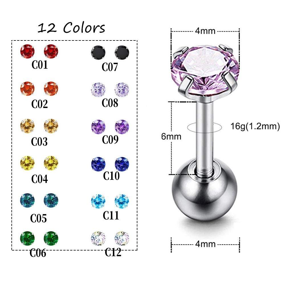 12 Pairs CZ Ear Stud Mixed Colors Cartilage Earrings Set Stainless Steel Barbell Studs Earrings Helix Tragus Piercing