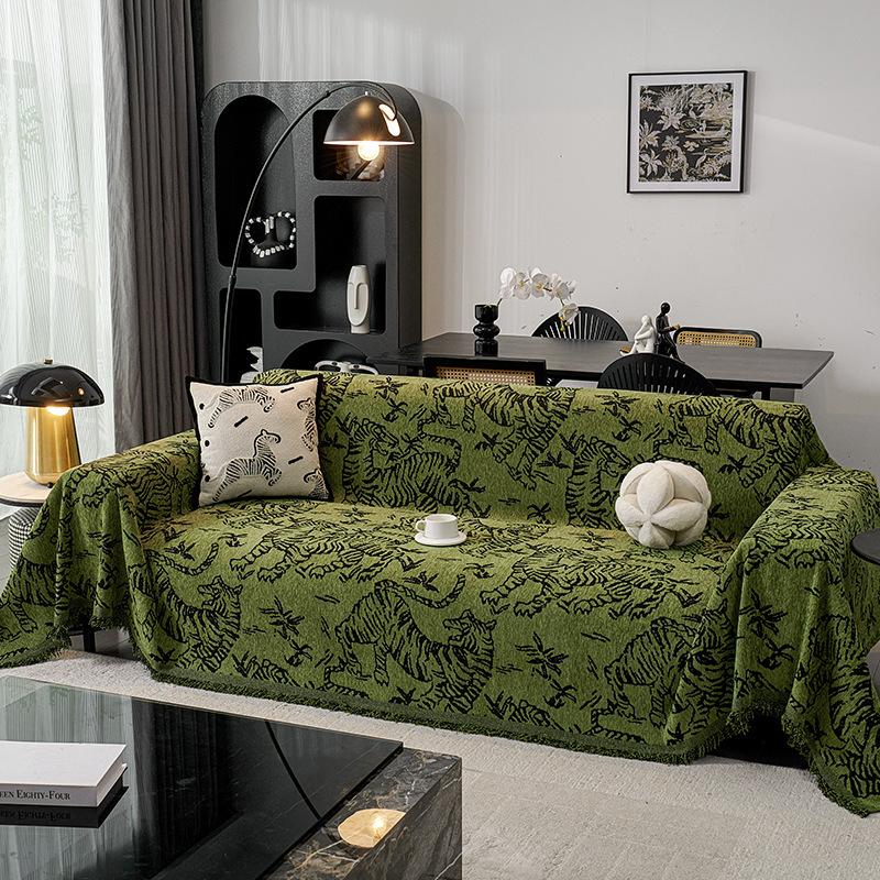 Green Chenille Slipcover Retro Tiger Animal Anti Cat Scratch Furniture Protector Bedspread Couch Towel Full Cover Blanket 3 Set