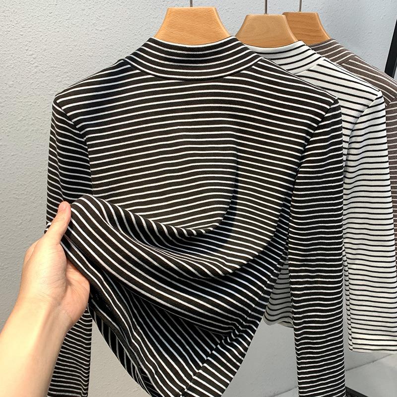 Semi-turtleneck Bottoming Shirt Women's New Women's Clothing Contrasting Colors Striped Polished T-shirt Warm Inside with Waist Top