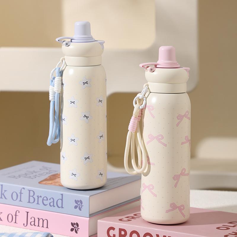 Cute Cartoon Fashion Straw Cup Large Capacity Student Dual Water Bottle, Stainless Steel Insulated Flask, Bow Bear Pattern