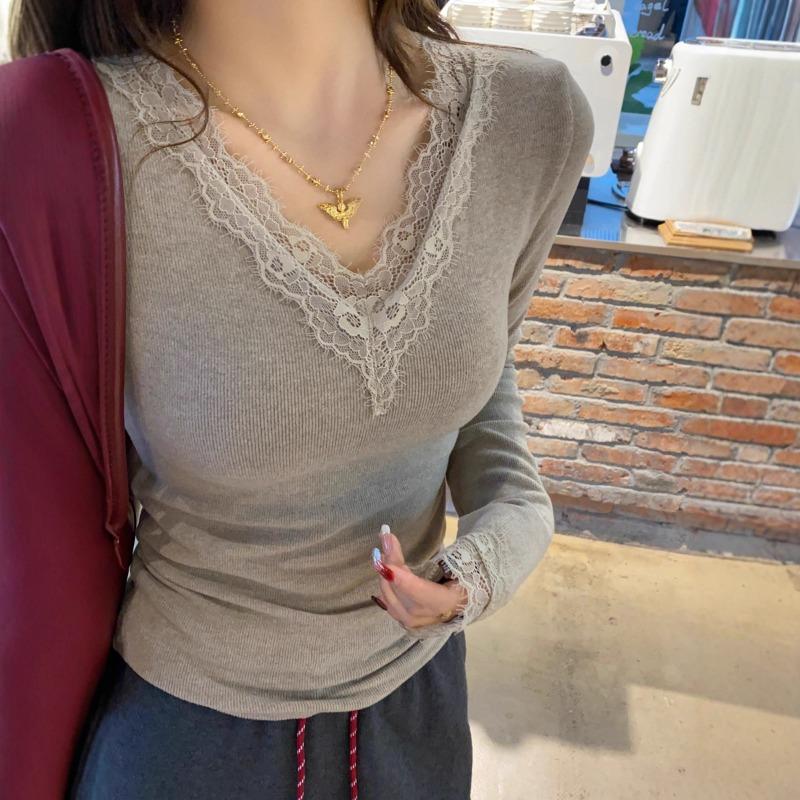 Neck Lace Low Neck Gray Bottoming Shirt Women's Inner with Early Autumn New Slim Black and White Top