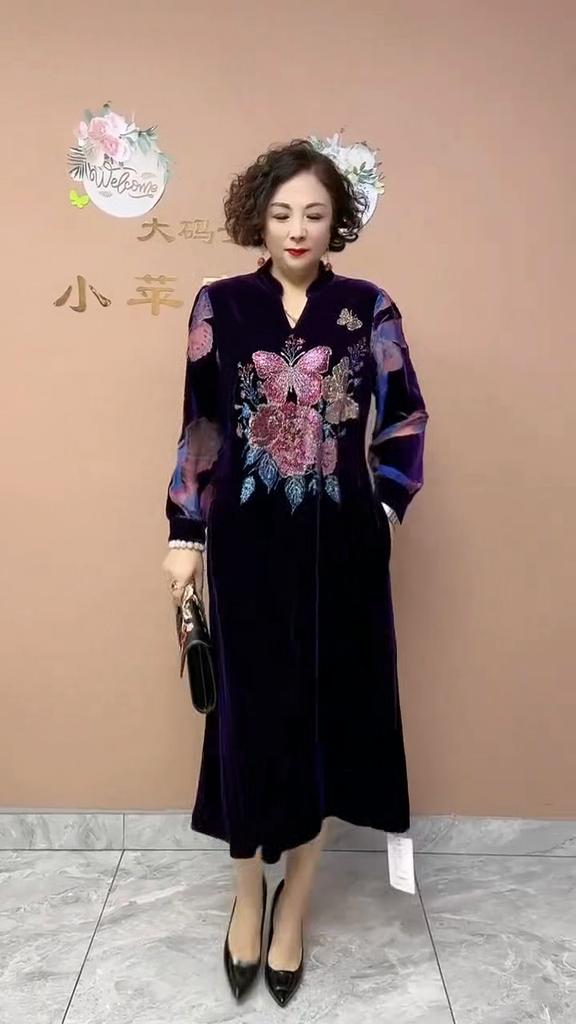 High-end Women's Velvet Dress Plus Size Long Dress Rhinestone Printed Loose Flocked A-Line Dress Spring Autumn