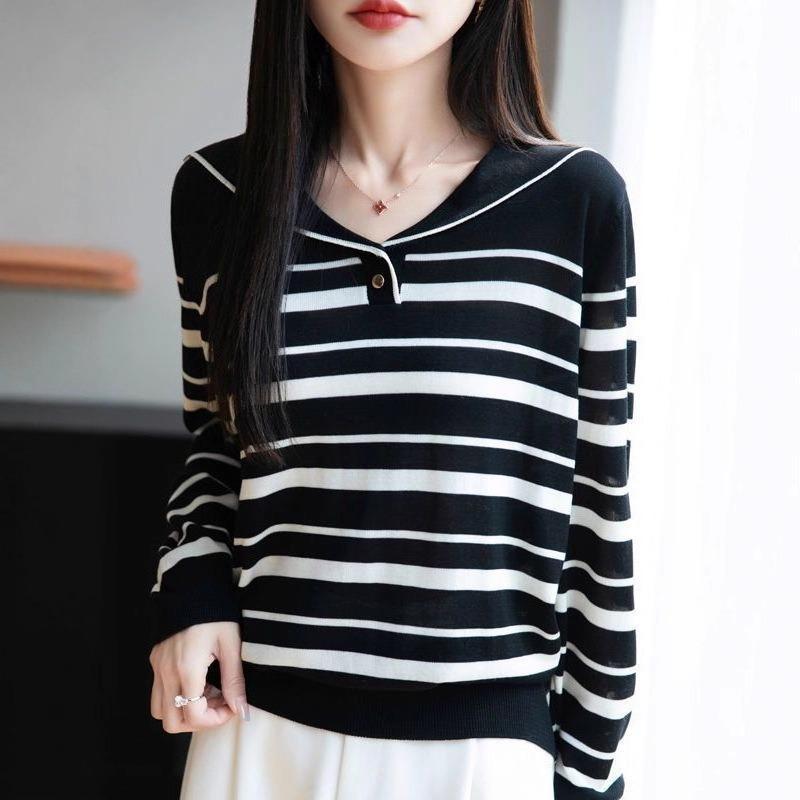 Navy Collar Striped Knitted Sweater Women's Sweater Bottom Shirt Loose Lyocell Lapel Long Sleeve Top Women's