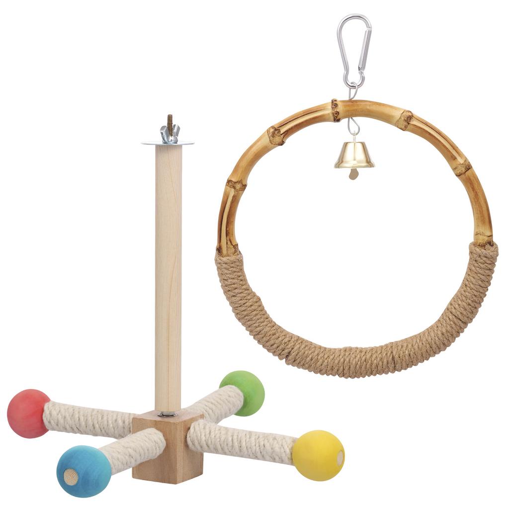 2Pcs Bird Standing Toy Set 360° Rotatable & Bell Wooden Interactive Spinning Parakeet Toys for Bird Cage Accessories NEW