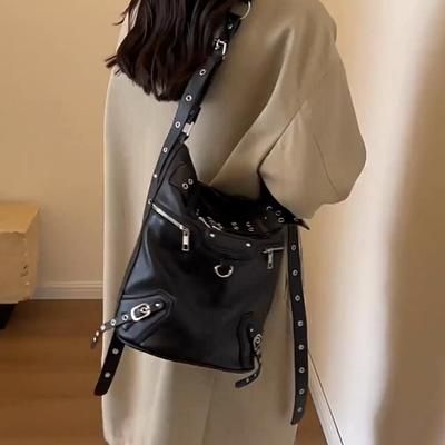 Hot Girls Vintage Large Capacity Bucket Bag Black Punk Goth Rivet Motorcycle Shoulder Bag Pu Leather Tote Crossbody Bag