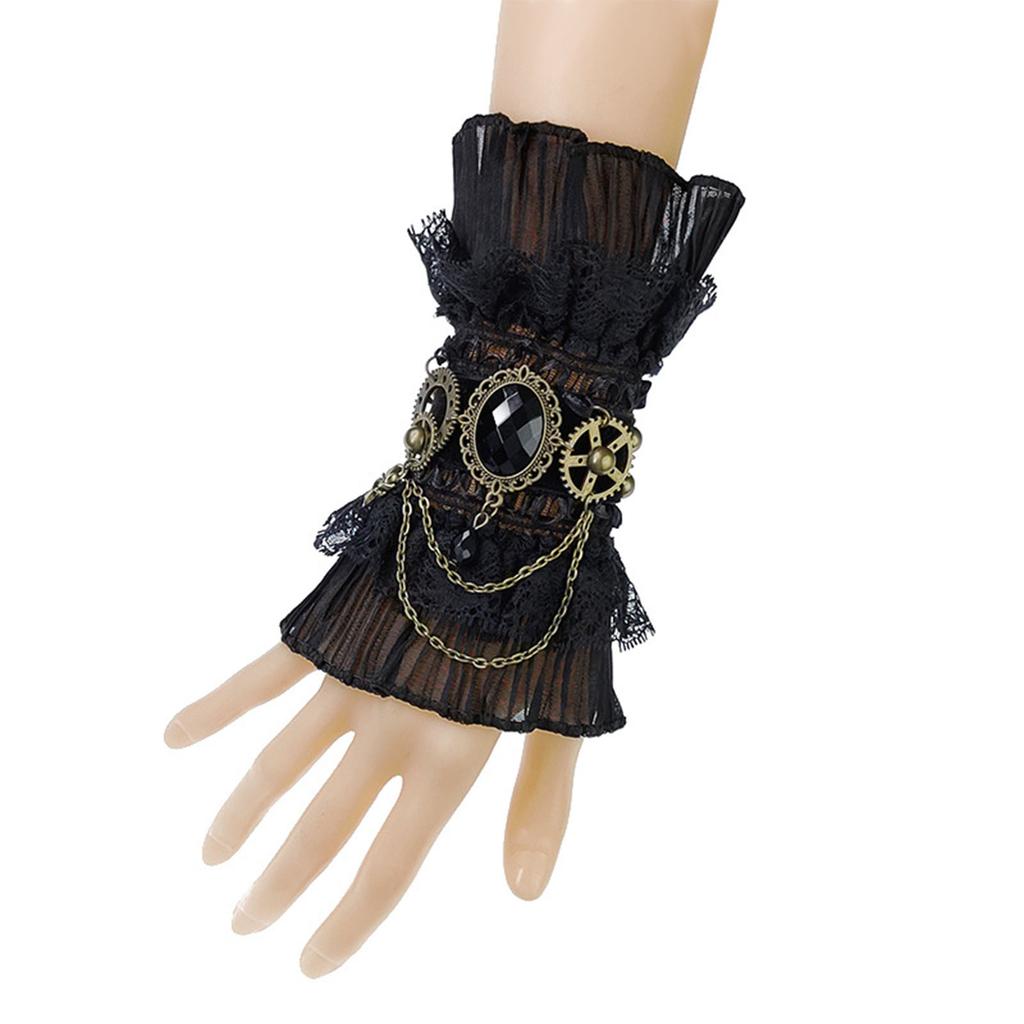 Gothic Steampunk Ruffled Lace Wrist Cuffs Fake Sleeve Crystals Gear Fingerless Gloves Halloween Arm Warmer Bracelet