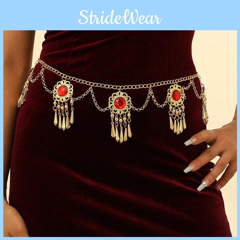 This bohemian-style red acrylic gemstone waist chain features a Flowershaped pendant with delicate tassels, adding an exotic touch to outfits. Crafted from durable alloy with electroplated finish,Ideal for festival attire or fashion accessories during summer events. Wipe clean with a soft cloth for maintenance.