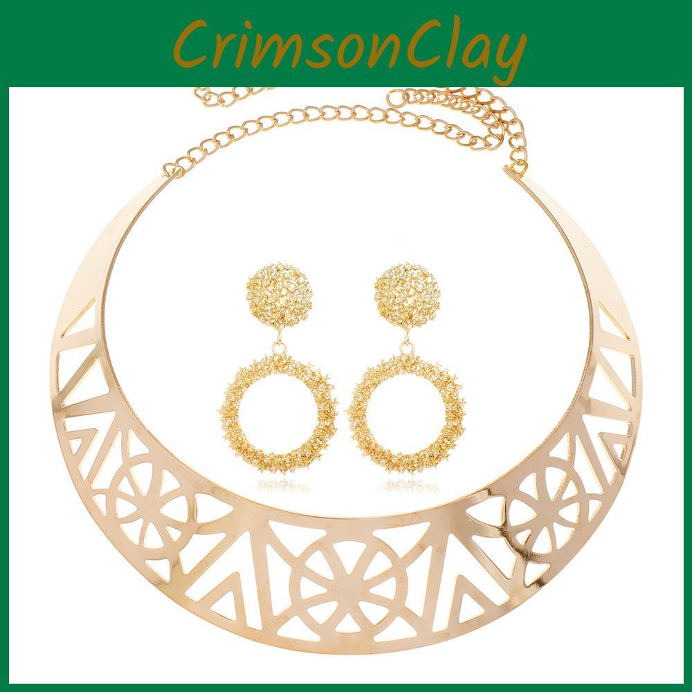 Fashion Solid Color Hollow Design Women Metal Necklace Collar Round Set Earring