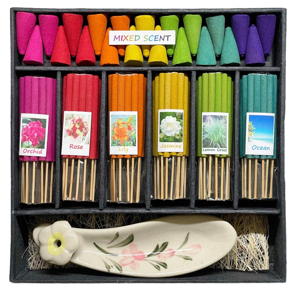 KURASHI Thai Incense Sticks, Incense Cones, Pagoda Incense, Triangular Incense, Set of 6, with Incense Holder
