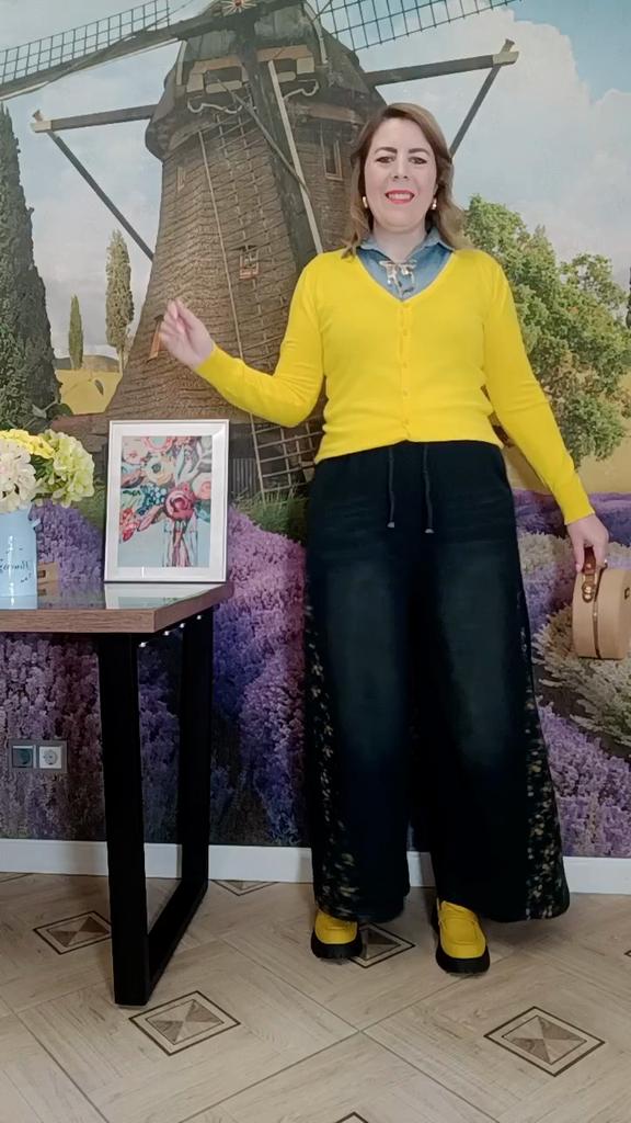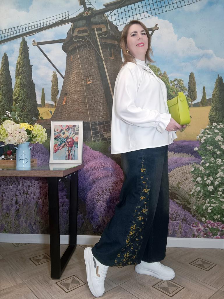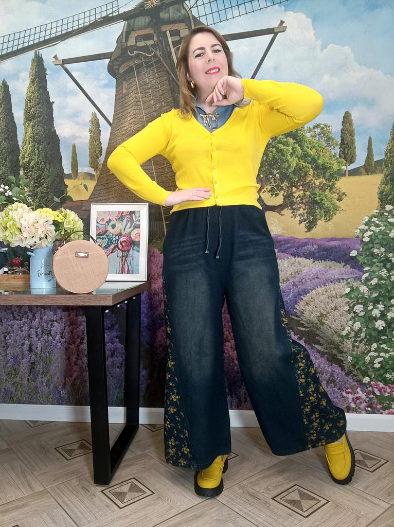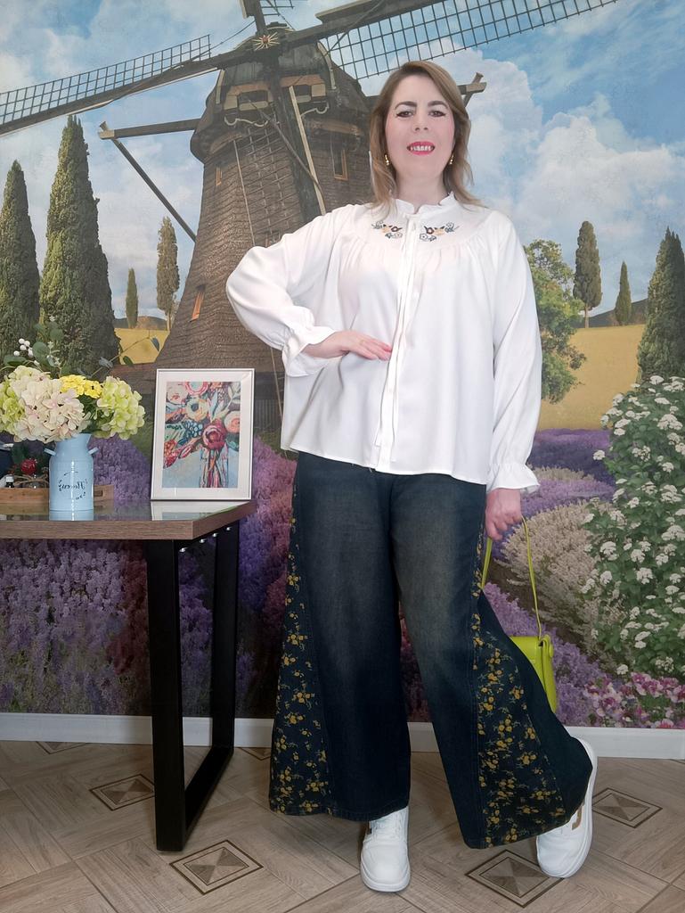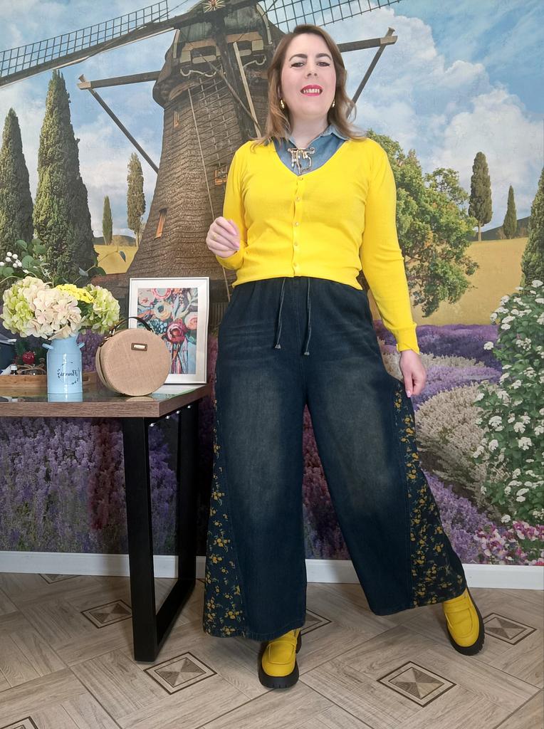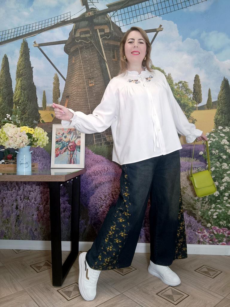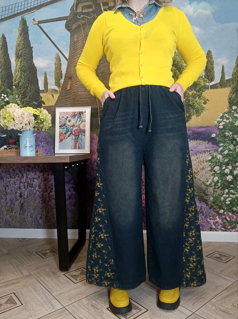 Plus Size Spring Autumn Women Casual Loose Jeans High Waist Floral Print Drawstring Patchwork Baggy Denim Pants Vintage Straight Wide Leg Jeans