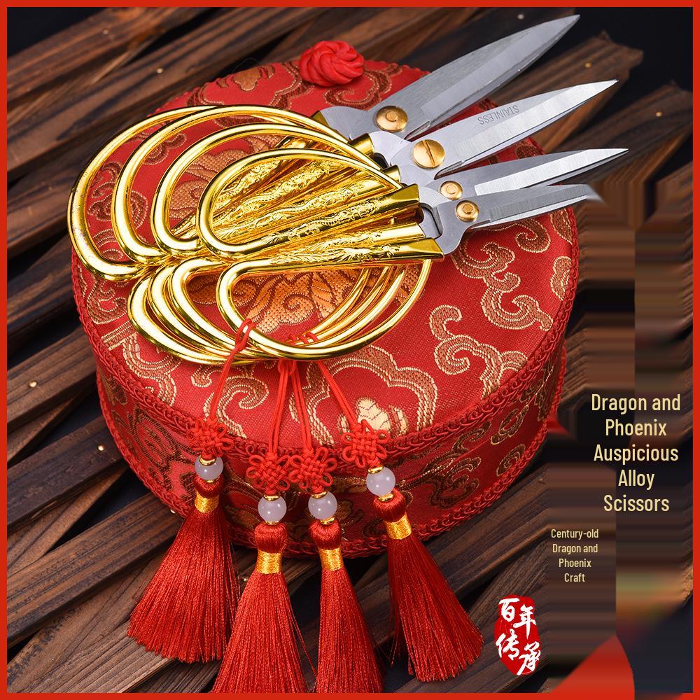 Golden Dragon & Phoenix Wedding Scissors: Handmade Alloy for Ribbon Cutting, Dowry Trays, and Happy Openings
