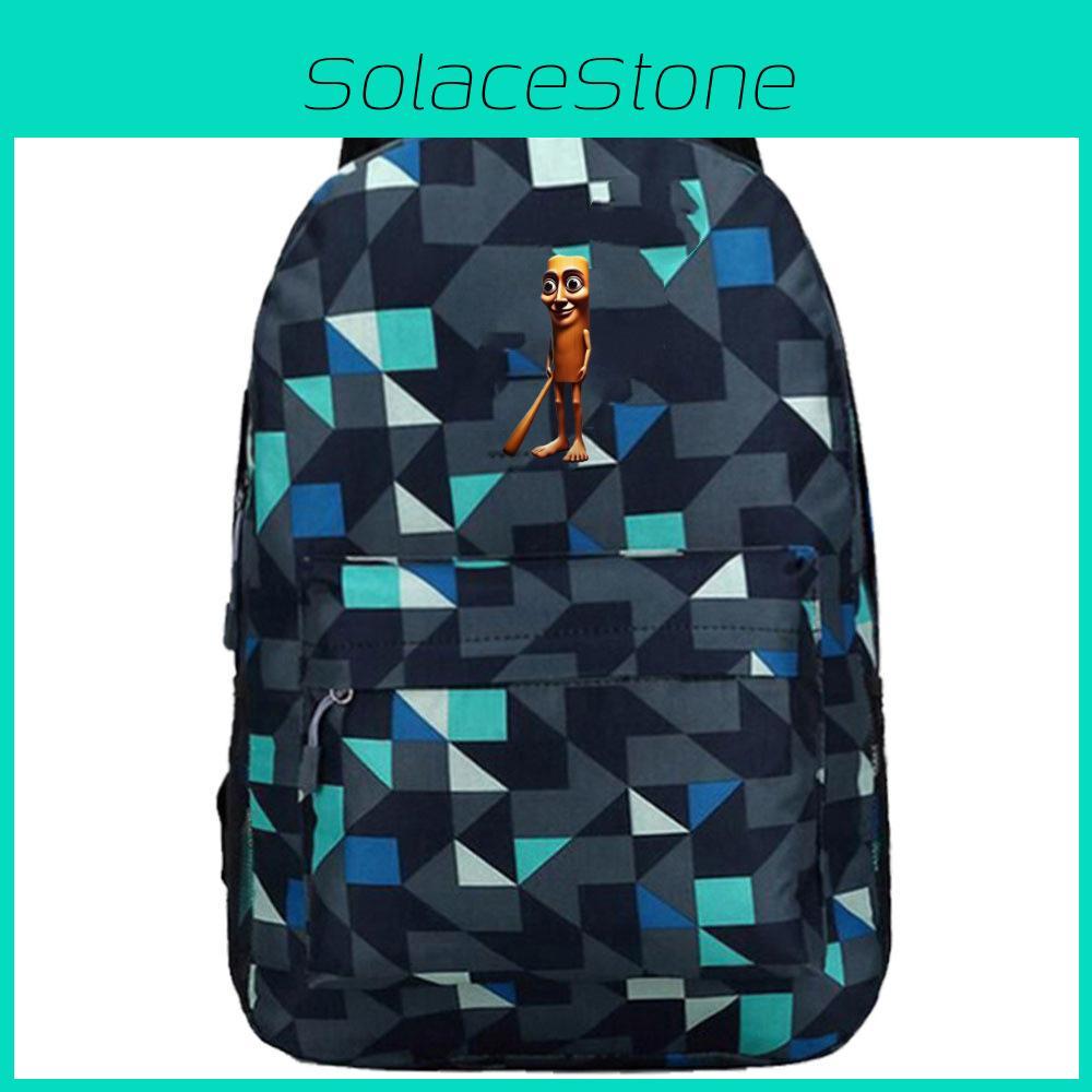 This casual backpack features durable canvas material with a breathable nylon lining, measuring approximately 12 inches high, 10 inches wide, and 4 inches deep. Its playful character pattern and chain accents add a fun touch, making it suitable for outdoor activities or school use. The curved shoulder straps ensure comfortable carry. Wipe with a damp cloth for maintenance.