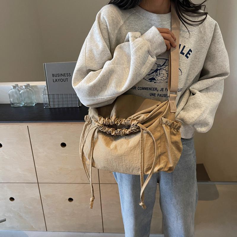 Couple Drawstring Oblique Span Bag Large Capacity Folding Messenger Bag Unisex Stray Bag Solid Color Casual Shoulder Bag