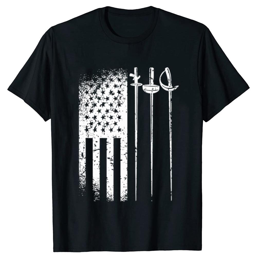 Funny American Fencing USA Flag Fencer T Shirts Men Pure Cotton Humor Streetwear Tee Shirt Short Sleeve Unisex Loose Clothing