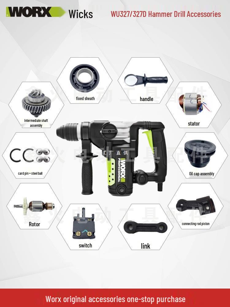 Wickes Electric Hammer WU327D Parts: Carbon Brush, Rotor, Stator, Connecting Rod, Switch, Gear, Oil Cap, Square Sleeve.