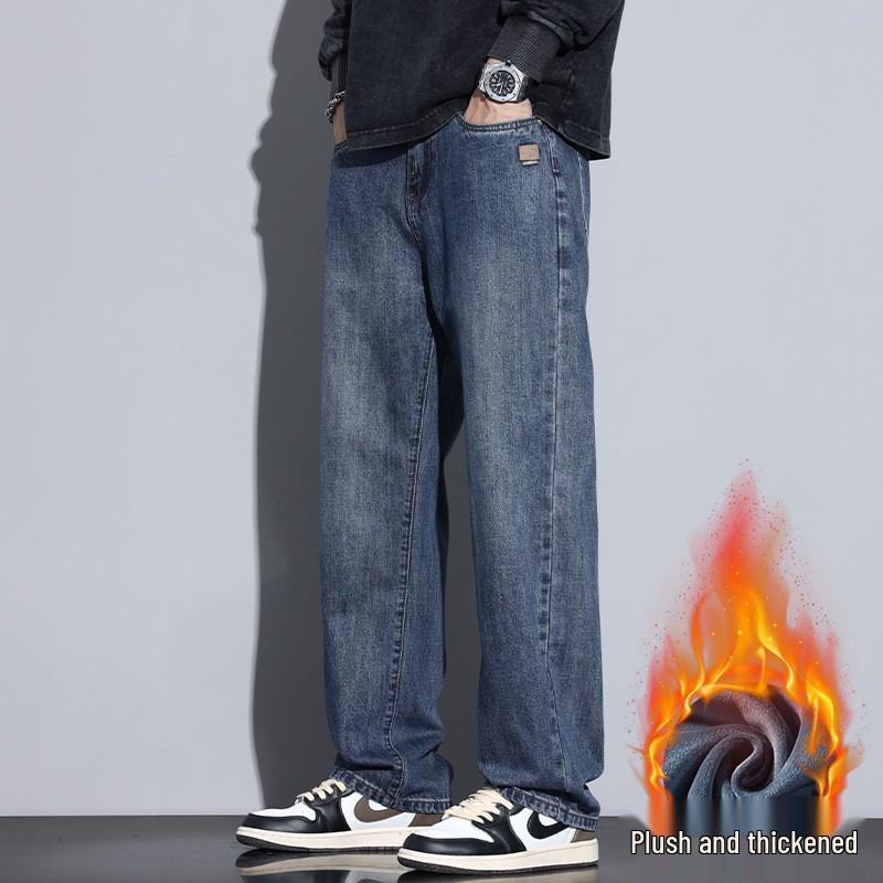 Introducing the perfect blend of style and comfort for the colder months: men's straight-leg loose jeans, designed with a nod to American retro aesthetics. These plus-size jeans are fleece-lined to ensure warmth and comfort in chilly weather. Crafted entirely from high-quality cotton, both the exterior and the inner lining prioritize ease and coziness, making them an ideal choice for autumn wear. The thickened fabric not only provides added insulation but also enhances the jeans' durability. Ideal for anyone seeking a casual yet stylish addition to their autumn wardrobe.