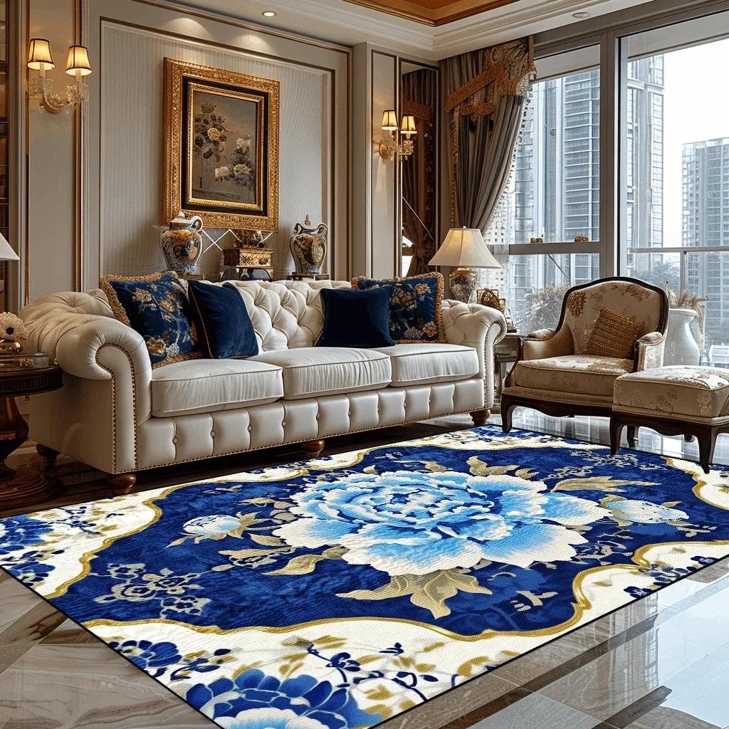 Deluxe European Style Carpet for Living Room Blue Home Decor Bedroom Tea Table Soft Rug Washable Short Plush Lounge Floor Mats