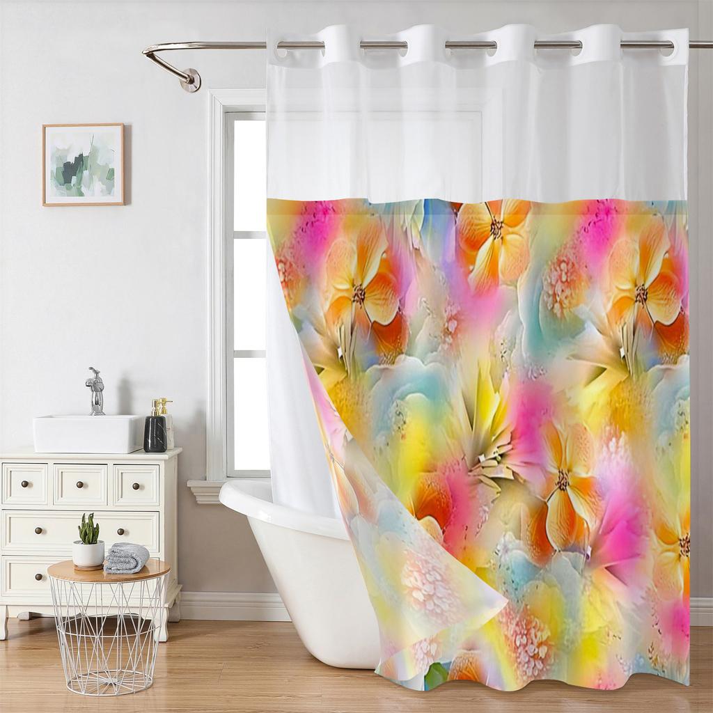 No Hook Floral Pattern Shower Curtain With Snap-In Fabric Liner, Sheer Top Window, Waterproof Double Layer Bathtub Curtain