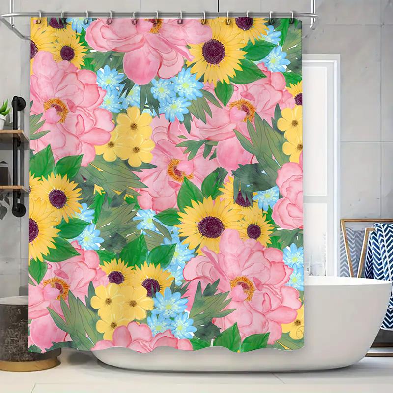 Bright Floral Waterproof Bathroom Shower Curtain Decor Set With Sunflowers, Pink Peonies And Bluebells Home Accents For A Sunny