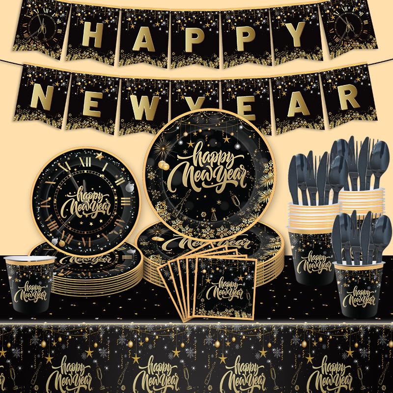 Black And Gold Happy New Year Theme Party Set Paper Cups Paper Plates Paper Towels Tableware New Year'S Arrangement Supplies