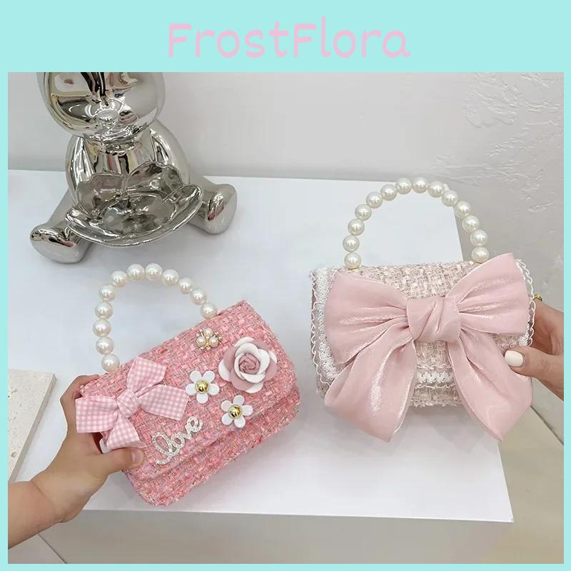 This children's fashion handbag features a stylish wool-blend exterior with a charming floral pattern, enhancing everyday outfits. Designed for young children,providing ample space for essentials. The bag is equipped with a pearl-embellished handle and a butterfly-shaped decorative accessory, adding a touch of playful elegance. Made from durable, lightweightmaterial with a polyester lining, it enables comfortable, versatile use for daily activities.