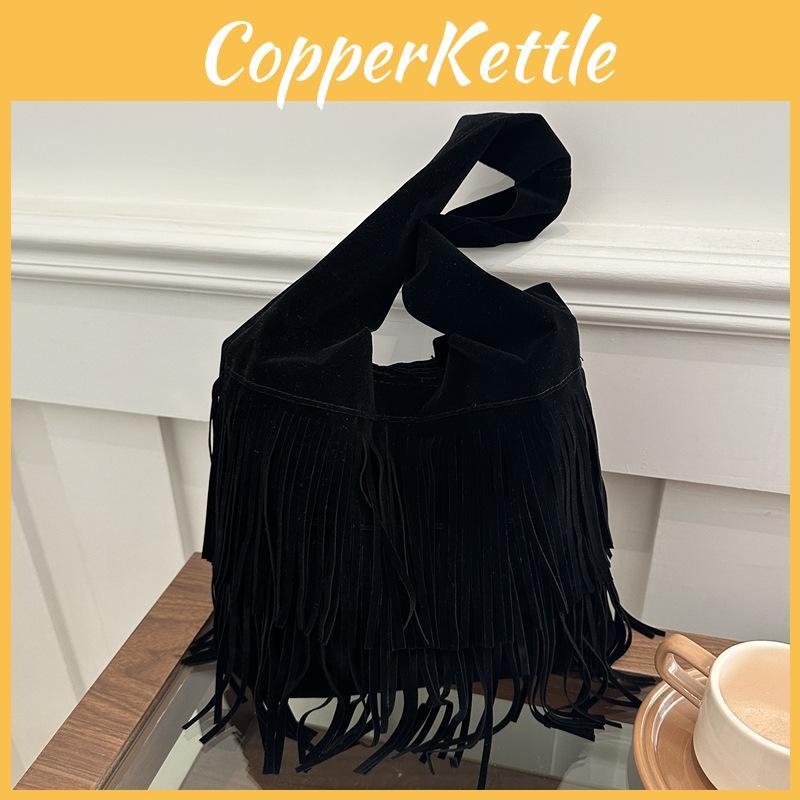 The Bohemian Fringe Tote Bag combines urban simplicity with practical design, making it an ideal accessory for daily use. Crafted with a unique material, this medium-sized bucket bag features a magnetic closure for secure access and a single shoulder strap for comfortable carrying. Its structured exterior includes a 3D pocket for added convenience, while the interior boasts a zippered compartment for organizing essentials. Measuring 12 inches in height and 10 inches in width, the bag offers ample space without compromising its lightweight and soft construction.