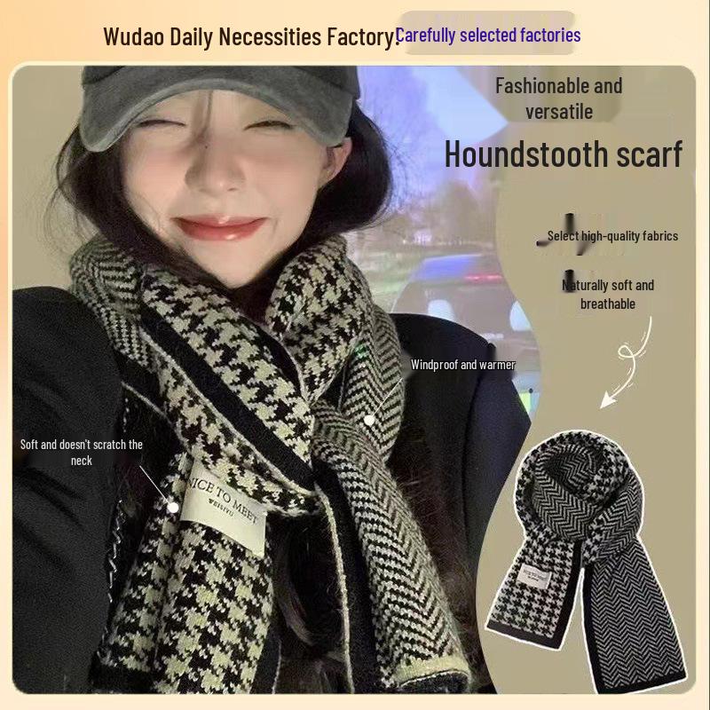 Korean Style Houndstooth Plaid Scarf - Versatile, Warm, Double-Sided for Autumn and Winter