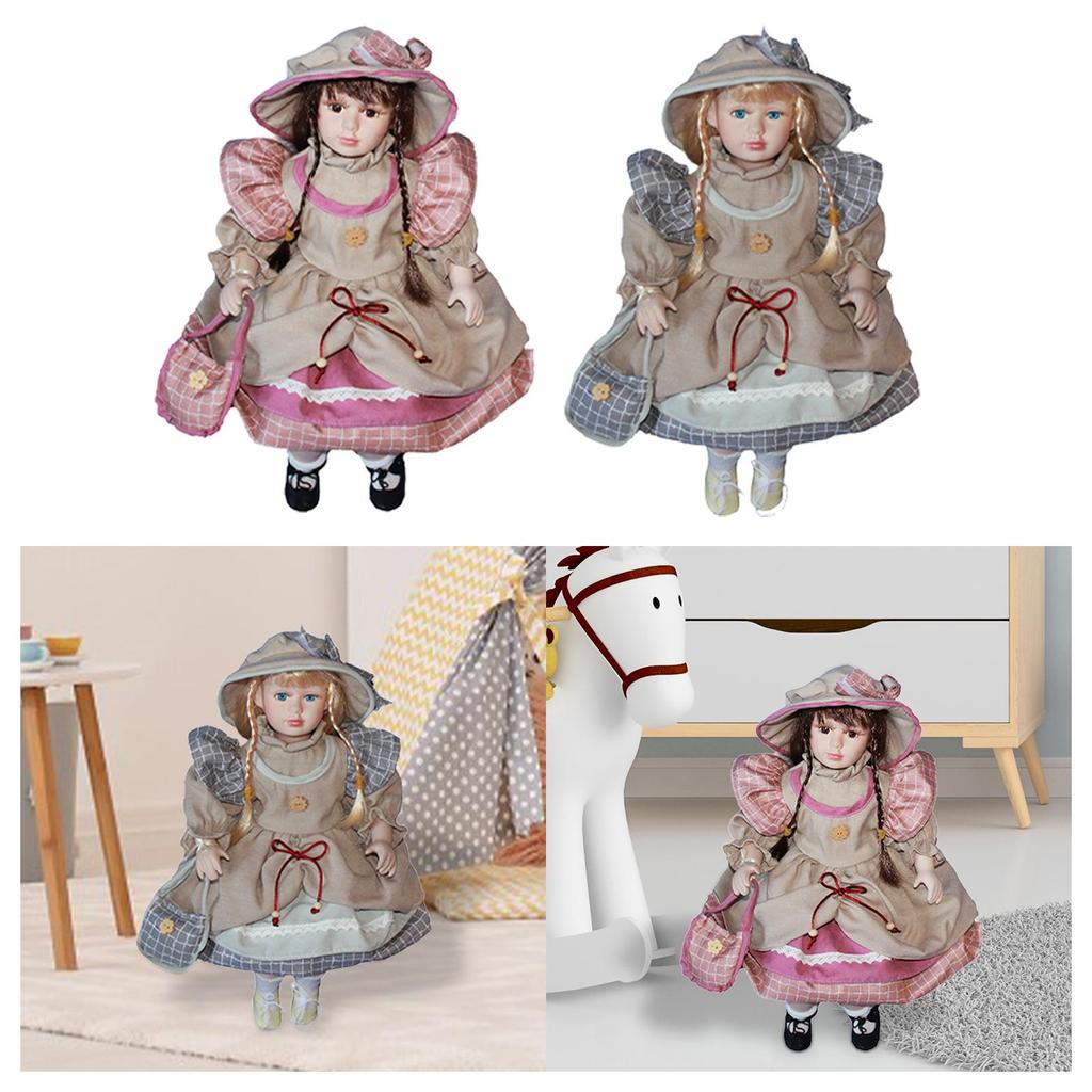 Ceramic Doll with Hat and Hair Glazed Makeup Face Elegant 17.72inch Collectibles Dress Up Porcelain Doll for Girls Birthday Gift