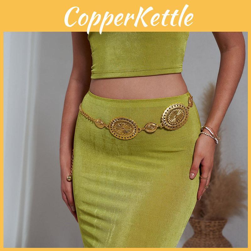 This metal waist chain features intricate engraved details, providing a stylish accessory for women. Crafted from durable metal, and includes a decorative floral clasp. Ideal for enhancing summer and winter outfits, it supports easy wear with a single-loop design. Wipe clean with a dry cloth to maintain its luster.