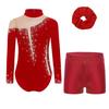 Girls Figure Skating Dance Set Long Sleeve Keyhole Back Sheer Mesh Patchwork Sparkly Rhinestones Leotard Shorts Hair Band