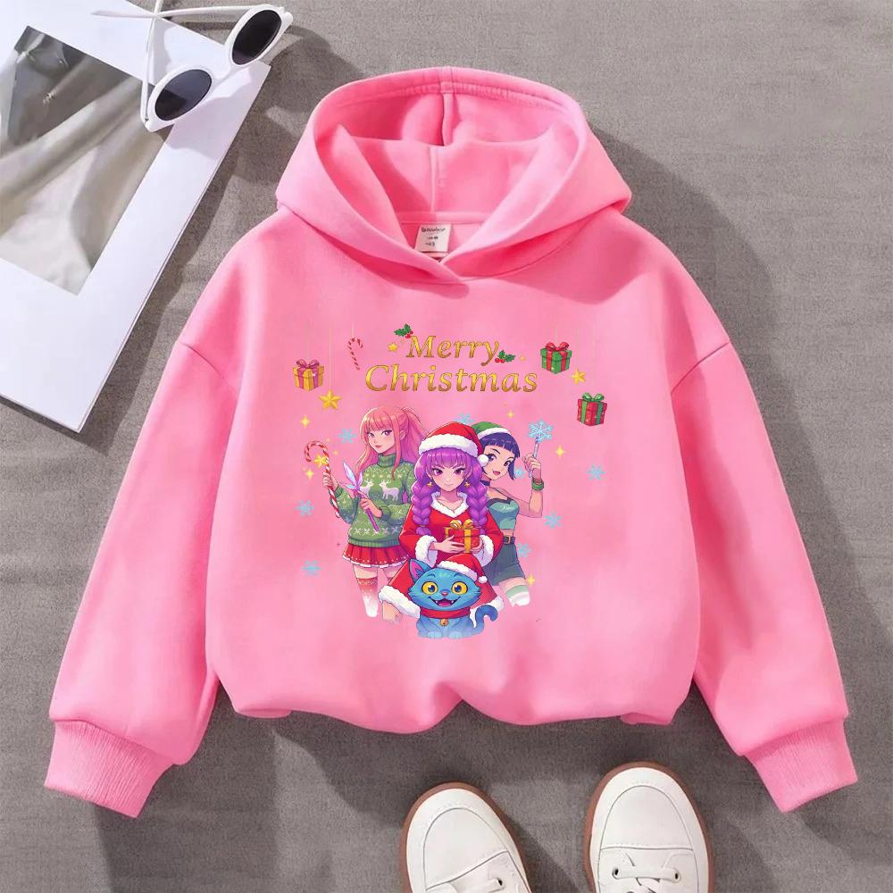 Festive Christmas Kids Hoodie with Adorable Anime Girls and Cute Cat Design for Season's Greetings