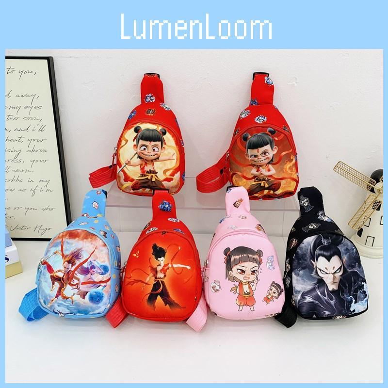 The Nezha Cartoon Kids Small Crossbody Bag features a durable polyester exterior combined with a lightweight nylon interior, measuring approximately18*14*6cm. Its playful anime-inspired design and vibrant color options make it suitable for daily use by children. Ideal for kindergarten and everyday activities, it supports easy carrying and organization. Wipe clean with a damp cloth for maintenance.