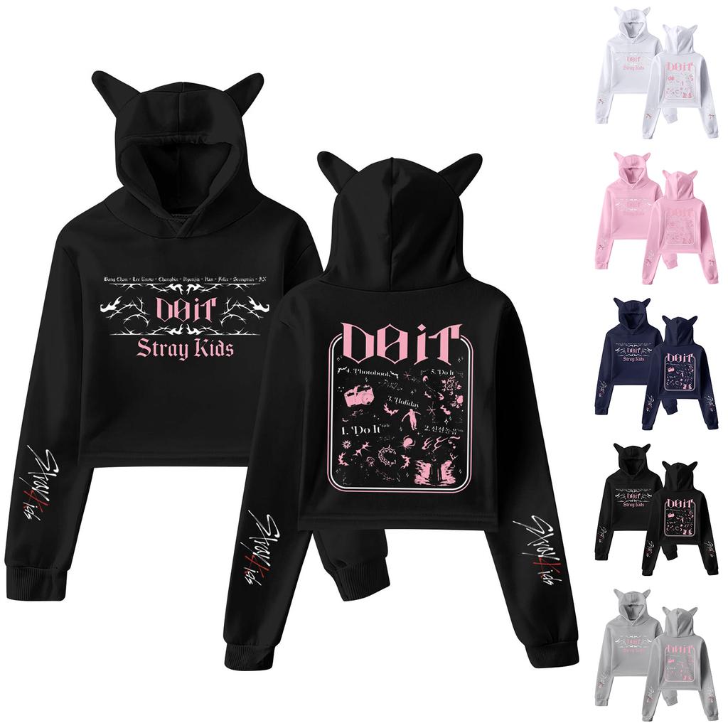 Stylish Women's Hooded Pullover Sweatshirt With Stray Kids Print, Trendy Long-sleeved Top.