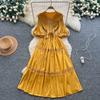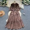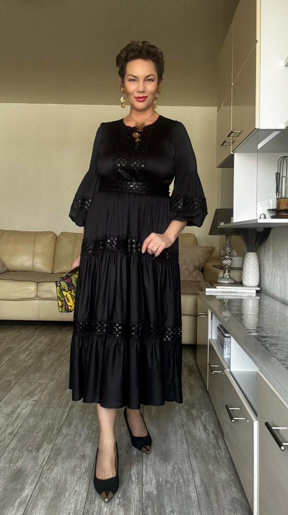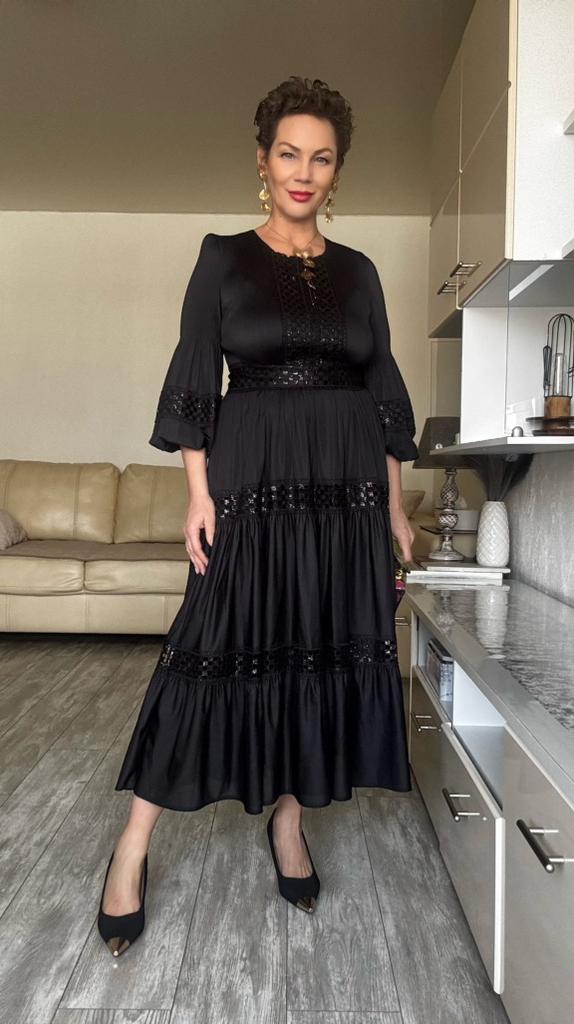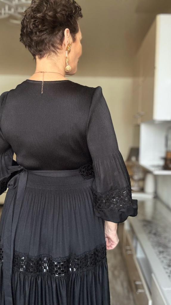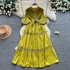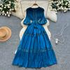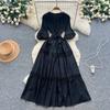 High-End Heavywork Lacing Paillette-Panel Waist-Banding Lantern Sleeve Maxi Dress for Women Autumn Charming Long Women Dress