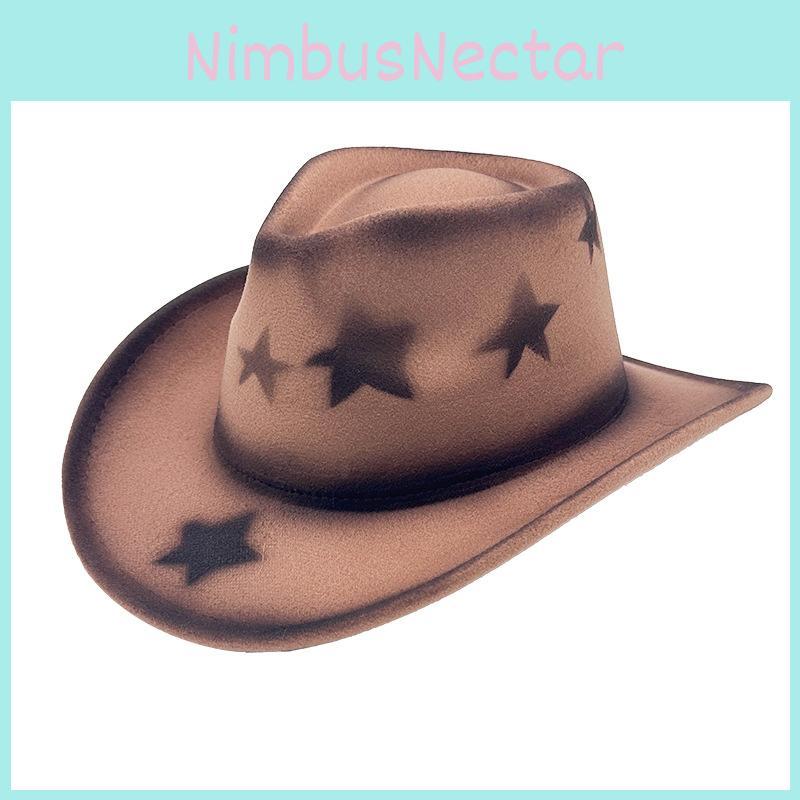 This cowboy hat features a wide brim and pinched crown, crafted from polyester wool blend for durability and breathability. Measuring approximately 22 inches in circumference size M: 56-58cm, it offers sun protection and insect resistance. Ideal for outdoor activities, it combines western style with artistic accents like star spray paint. Wipe clean with a damp cloth to maintain its appearance.