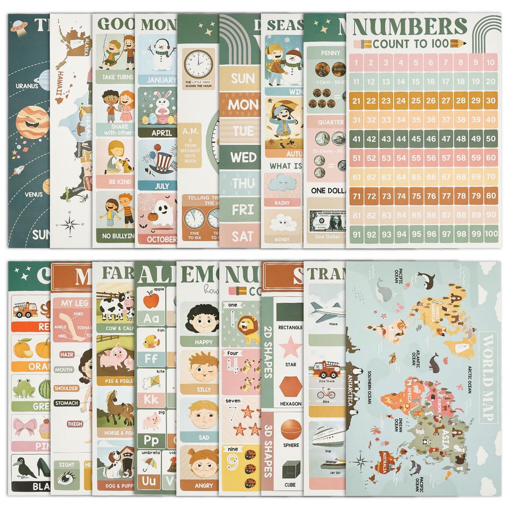 18 Educational Posters for Toddlers ABC Chart, Numbers, Colors, Days of The Week, Boho Classroom Home Decor Learning Posters