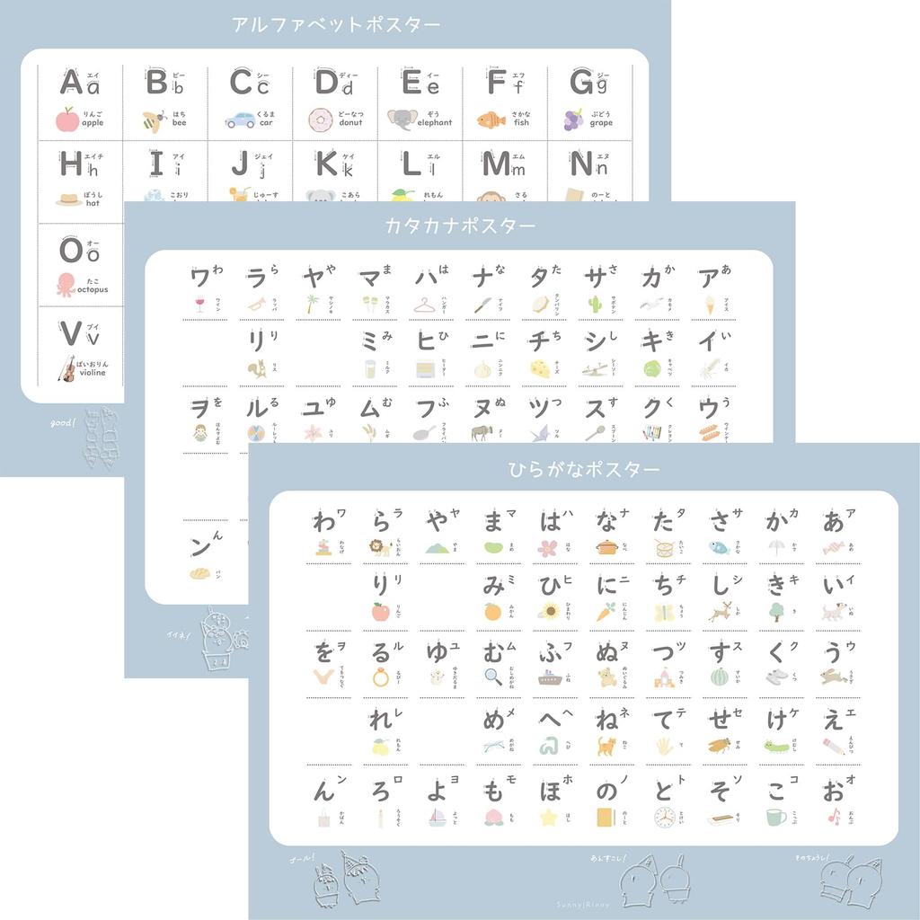 Stylish Bath Posters: Set of 3, Hiragana, Katakana, and Alphabet Learning Posters, A3 Size, A-I-U-E-O Chart, Katakana Chart, and English Chart.