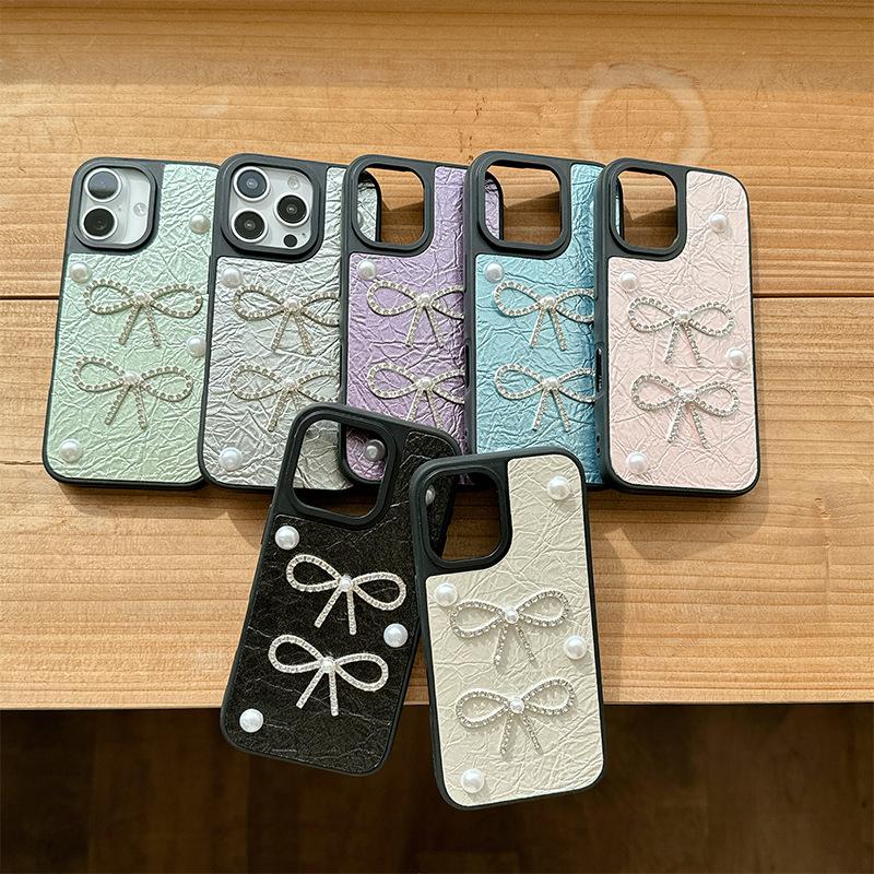 Pearl Bow Phone Case for Apple 17promax Leather Texture High Quality for IPhone16pro Protective Case