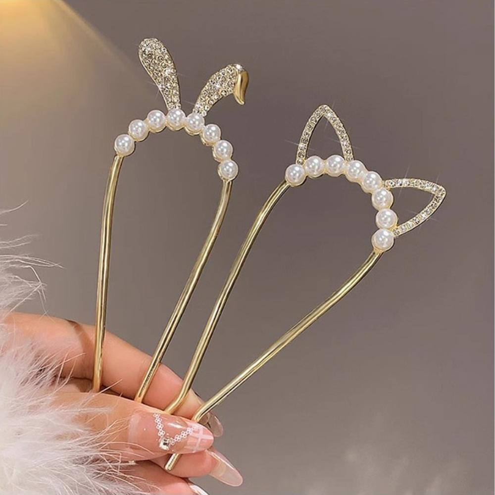 1pc Exquisite Fashion Cat Ear U-Pin Hair Clip Pearl Rhinestone Chinese Ancient Style Hairpin Elegant Headdress for Women