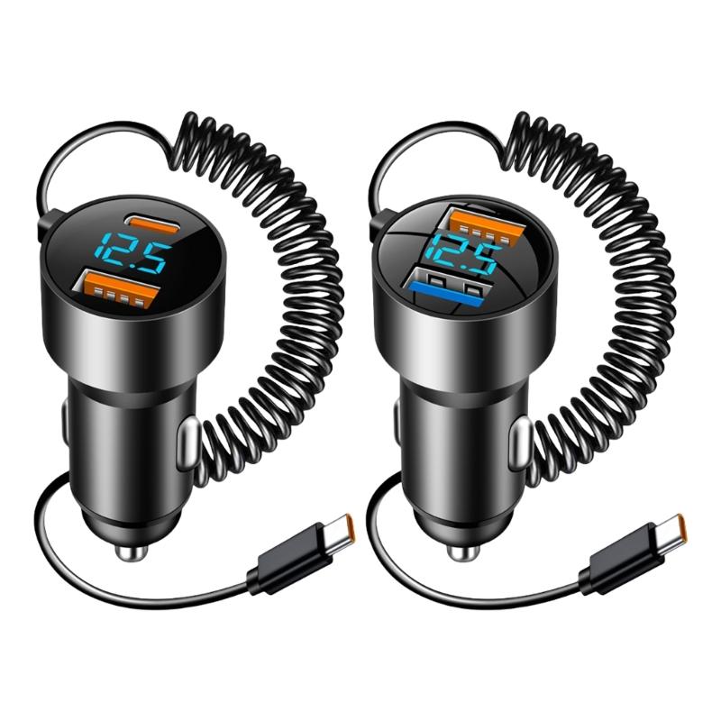 Super fast charging car charger, 3 in 1 integrated spring coiled wire car charging adapter, with 150cm Type C charging cable.