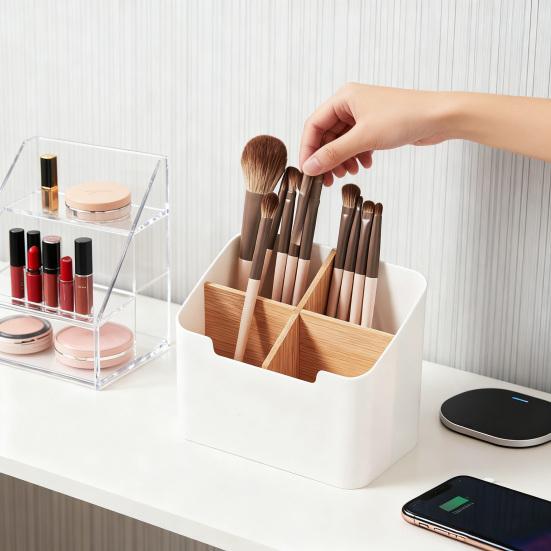 This versatile storage box is designed to declutter your workspace with a modern, minimalist style. Crafted from durable plastic and wood, it measures 5.7 x 3.5 x 4.6 inches, making it compact yet spacious.